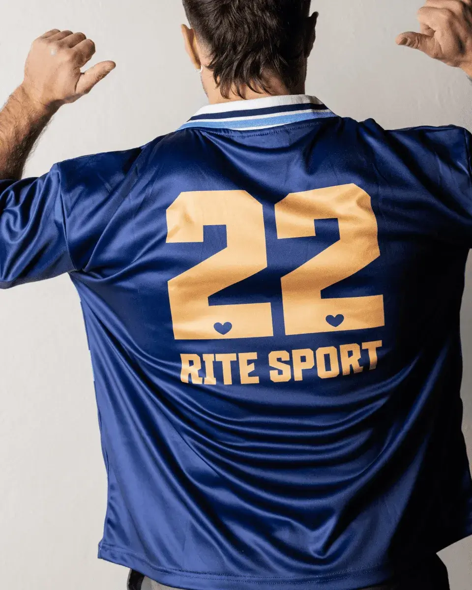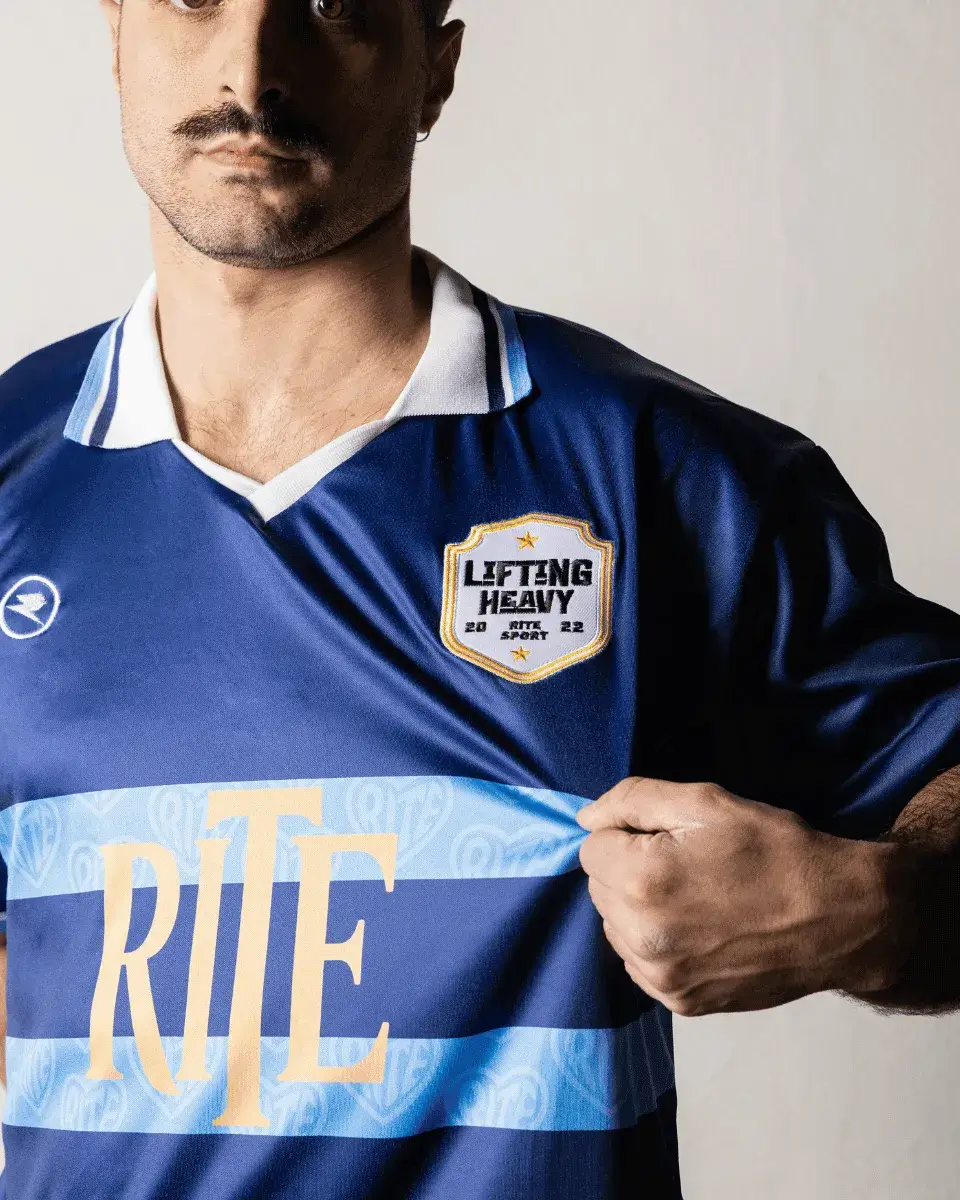 La camiseta azul RITE de crosstraining con inspiración retro fútbol. Diseño clásico, actitud old school y preparada para entrenar duro o llevarla fuera del box. Comodidad, resistencia y sentimiento de equipo en una sola prenda.